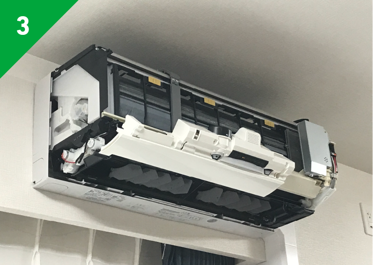 エアコン本体の部品を1つずつ取り外し分解します。各メーカーの機種に合わせて部品が破損しない様に丁寧に分解を行って行きます。