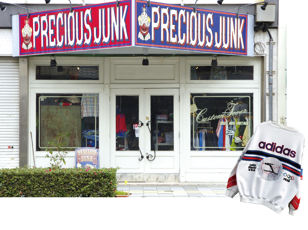 アメリカ西海岸のスケーター、サーファー達の“ユルく、ダサかっこいい”がコンセプトで、オーナーさんがアメリカから直接買い付けてきたユーズド、ヴィンテージのお洋服がぎっしり並んでいます。道を挟んだ向かいの棒屋第一ビルには二号店のPRECIOUS JUNKさんがあります。