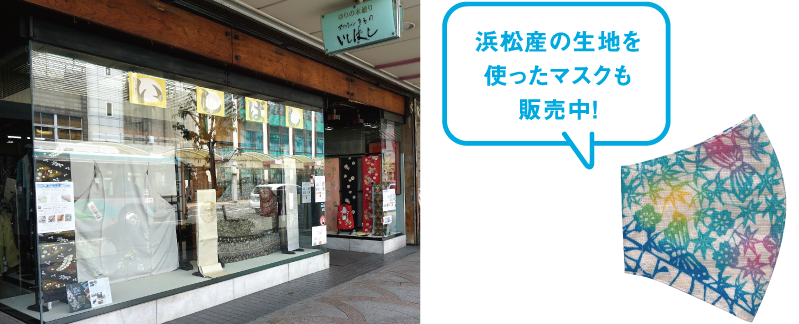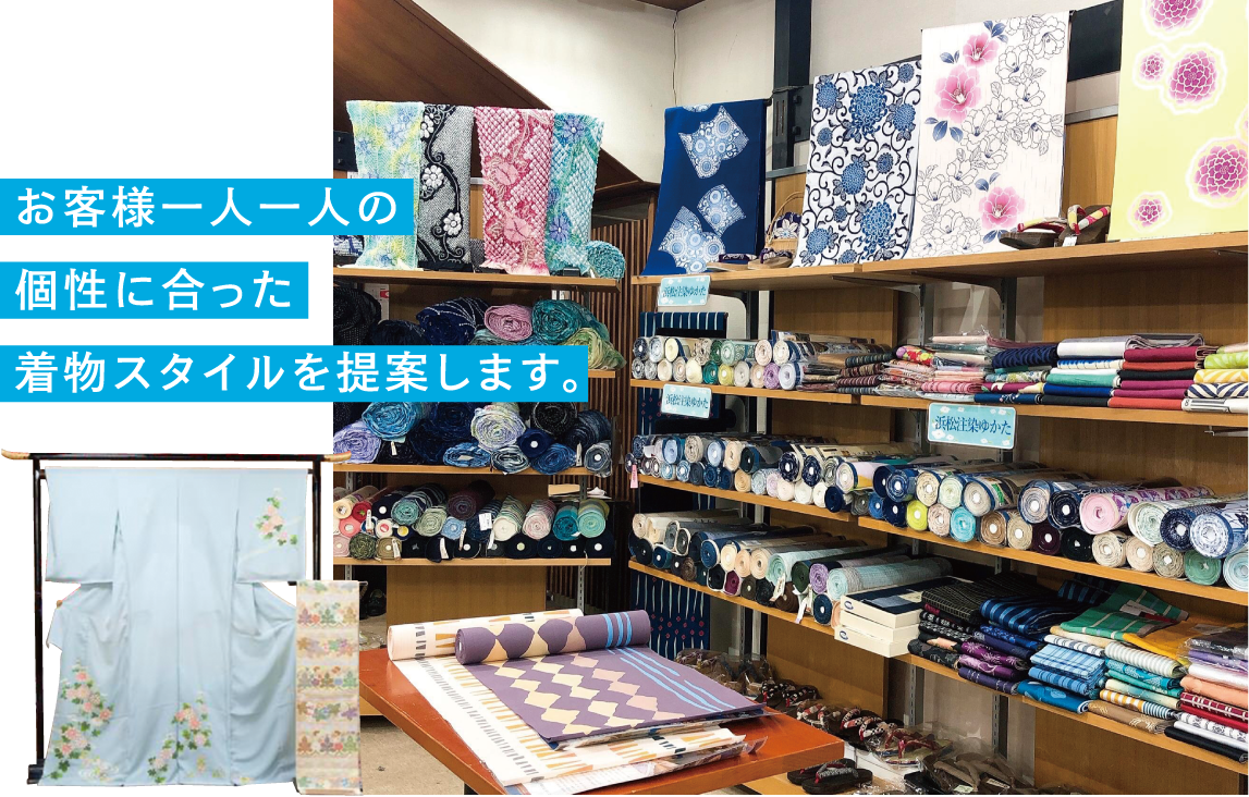 カジュアルなお洒落着物からこだわりの逸品まで、幅広く豊富な品揃えの呉服店です。地元浜松の伝統技術である『浜松注染そめ』の浴衣や手ぬぐい、遠州木綿の着物なども多数取り扱っています。浜松注染そめのマスクも販売中!