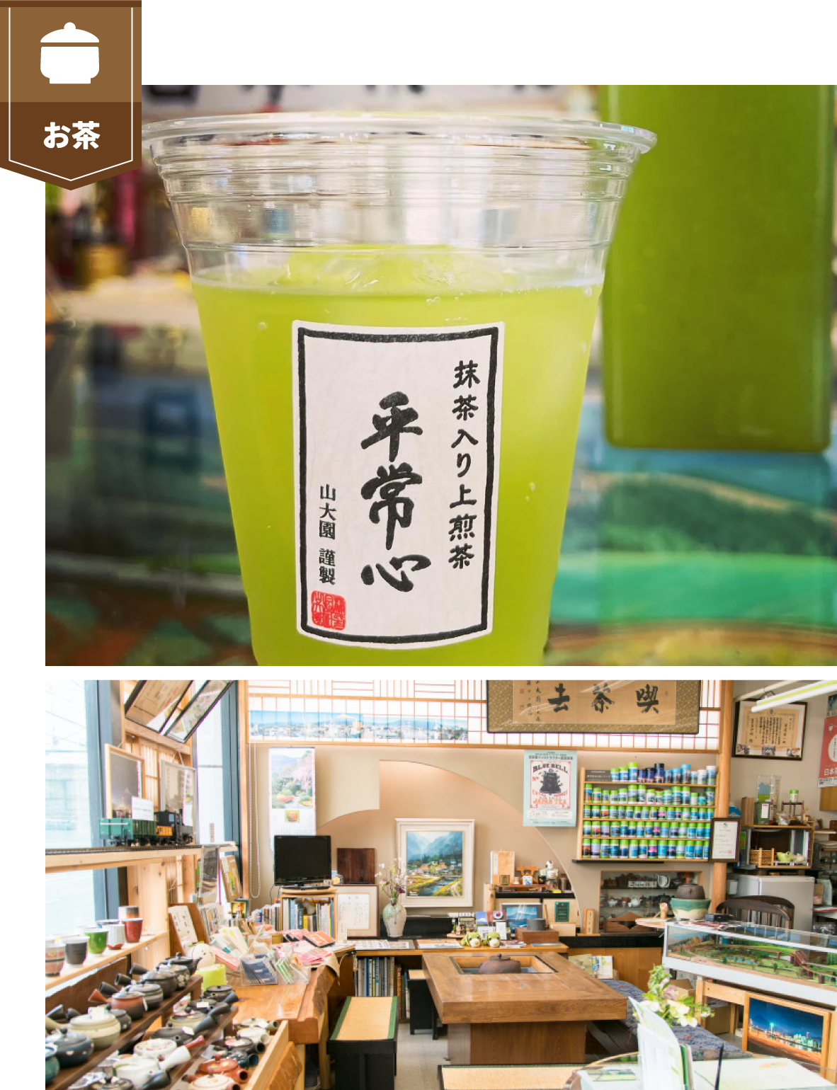 静岡産の焙煎の効いた上煎茶と京都産の本格抹茶を絶妙なバランスでブレンドした抹茶入り上煎茶平常心や岳南電茶など、様々な銘茶をお届けしています。富士ブランド認定商品、山大園のオリジナル茶缶は選べる富士山缶としてお客様に人気です。他にも富士に伝わるかぐや姫伝説を彷彿とさせる、切り株がほんのりと光る茶缶などがあります。贈り物にも最適です。