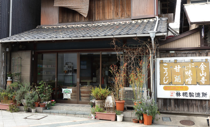 明治15年(1882)創業の糀専門店。昔ながらの製法で丁寧に糀作りを行っています。蒸した米に糀菌をつけ、徹底した温度管理で作られる米糀は200g300円(税込)〜。手作りの味噌や甘酒、塩こうじなど用途は多彩。尋ねれば作り方も教えてくれます。また店内では、薄めるだけで手軽に味わえる甘酒の素600g550円(税込)をはじめ、麦麹にニンジンやショウガなどを入れて仕上げた金山寺300円(税込)なども販売。醤油やだしなどの自然食品も並びます。