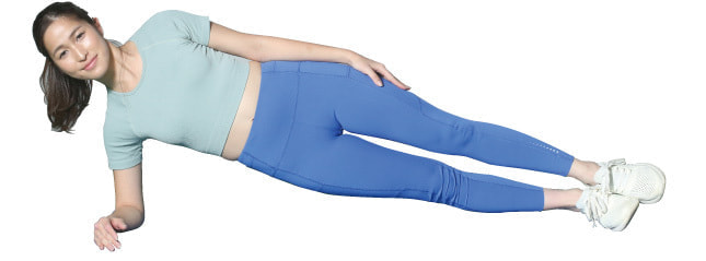前腕と足の外側で体を支えながら、腰を浮かせ体の軸を真っすぐにキープします。地面に付いていない足を上げ下げすれば、運動負荷がさらにアップ。