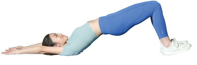 仰向けに寝て両ひざを肩幅に開いて立て、おしりをグッと一直線に浮かせて3秒間キープしたら、元の姿勢に戻ります。この運動を3〜5セット繰り返し行いましょう。