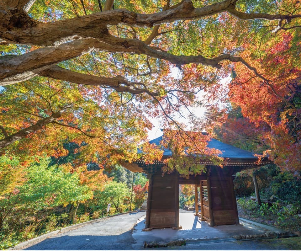 愛知県で最も遅い時季まで紅葉を楽しむことができ、「豊橋のもみじ寺」の愛称で親しまれている人気スポット。朱印紙を切り抜いて仏様の姿などを表現する「切り絵御朱印」発祥の寺としても知られています。
