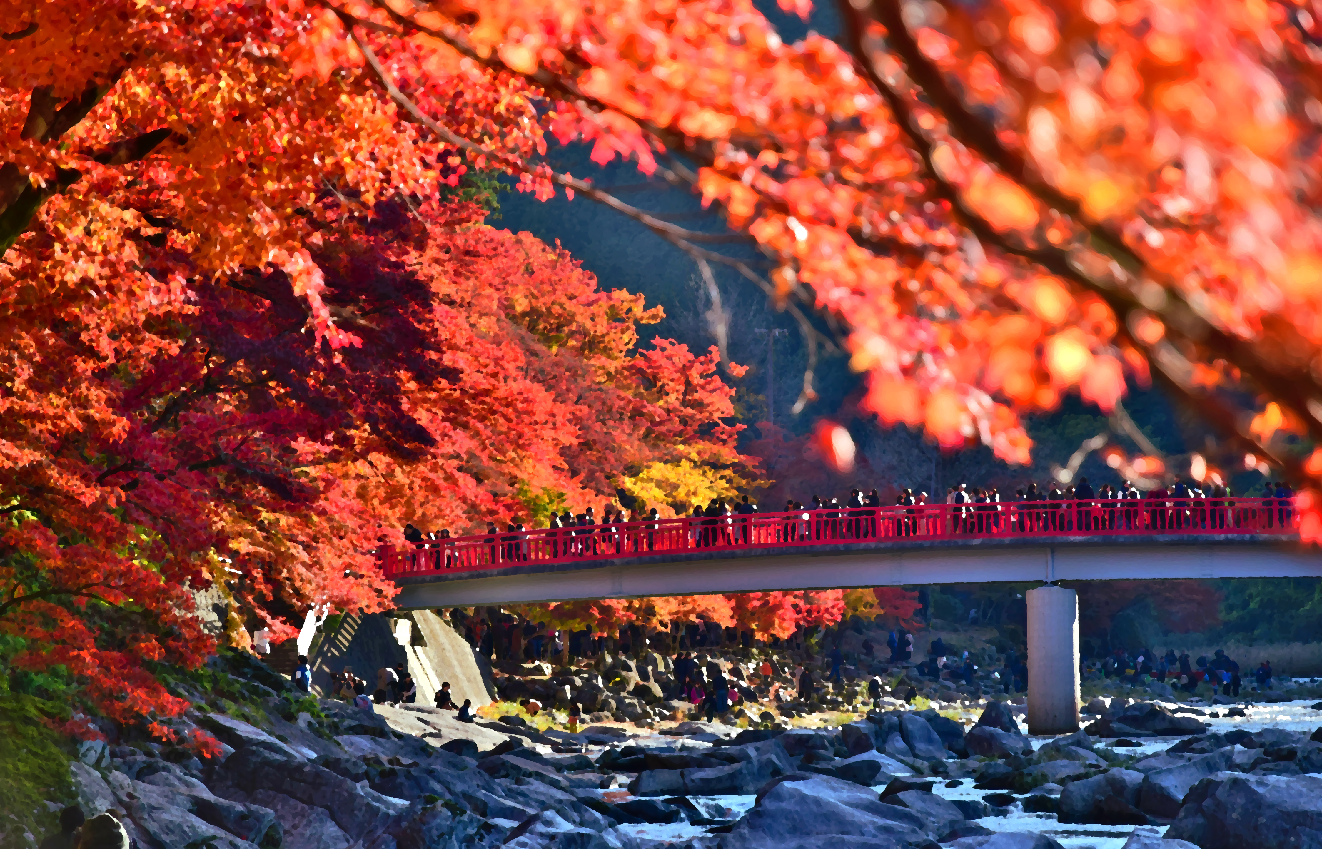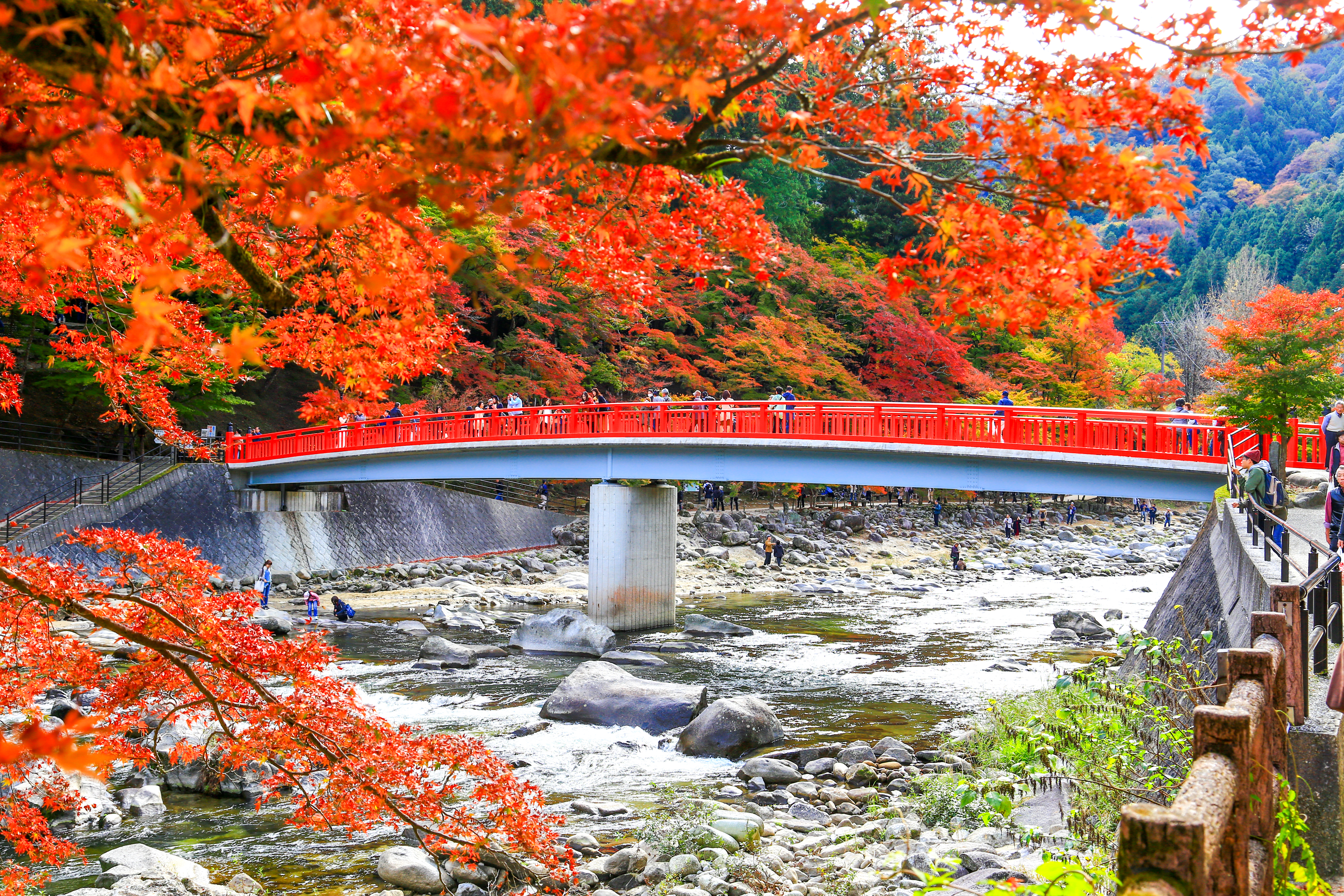 東海エリアの紅葉といえば、まず名前が挙がるのが愛知県豊田市足助町にある「香嵐渓」。 ここは江戸時代にまでさかのぼる歴史ある渓谷で、四季折々の自然が楽しめる場所です。特に秋の紅葉は圧巻で、11月には山一面が赤や黄色に染まり、全国から観光客が集まります。 「紅葉の名所」として有名ですが、実は新緑の季節や夏の川遊びも魅力的。香嵐渓を流れる巴川沿いを歩くだけでも、日常の疲れをリセットできるような清々しさを感じられます。 地元の人からすると、「一度は行ったことあるけど、わざわざ行くほどでも…」と思う方もいるかもしれません。ですが実際に訪れると、そのスケールの大きさに毎回「やっぱり来てよかった!」と感じるはずです。特に子ども連れで自然を満喫したい家族旅行にはぴったりの場所なんですよ。