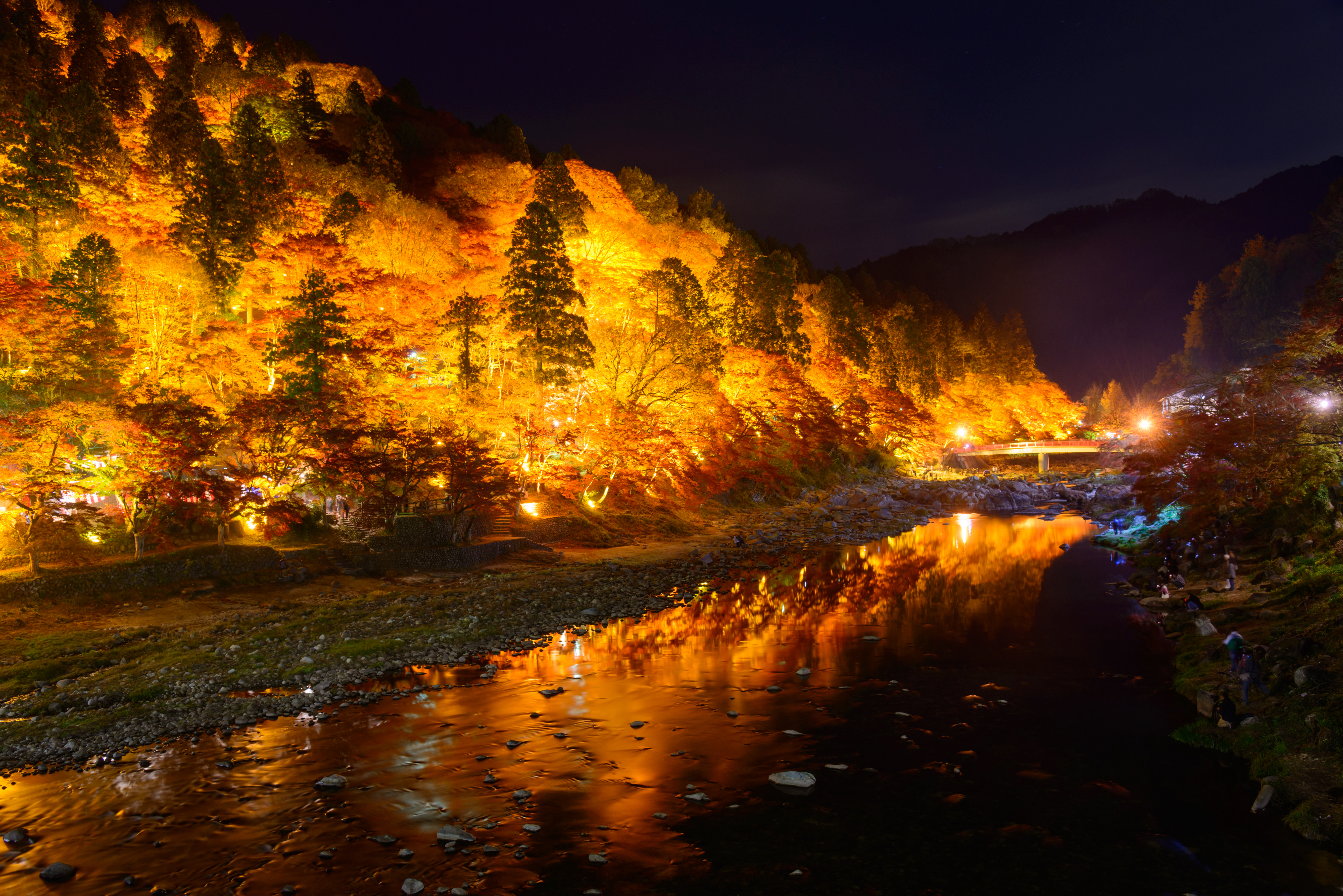 毎年秋に開催される「香嵐渓もみじまつり」では夜間ライトアップが行われます。昼間とは違う幻想的な世界に包まれる時間は、家族旅行のクライマックスにふさわしい体験です。