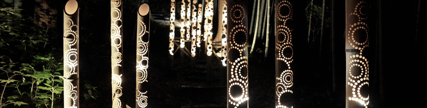 竹の中に彫られた模様からこぼれる光が山道をやさしく照らし、