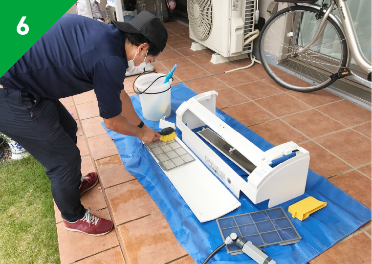 分解した外側のカバーやフィルターは別に手洗い洗浄を行いカバーの裏側など隅々まで汚れを落とします。
