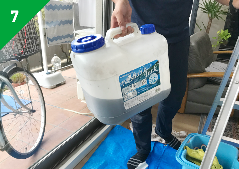 1回の洗浄で出た汚れた排水です。汚れの主な成分はカビと埃です。