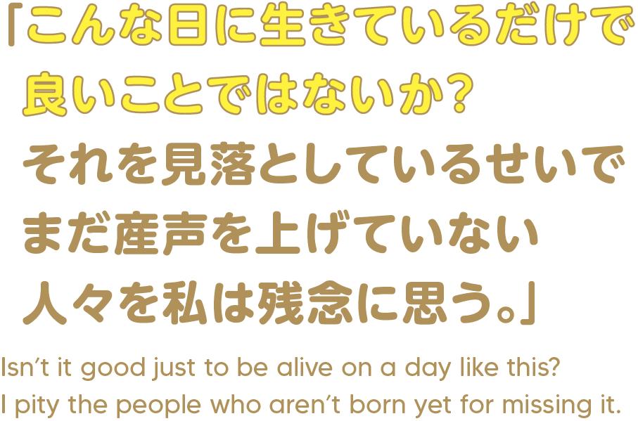 モンゴメリは、カナダ出身の女流作家。その代表作が児童文学の名作と言われる『赤毛のアン』です。孤児院で育ったおしゃべり好きでロマンチストのアンが成長していくストーリー。みなさんも一度は読んだことがあるのではないでしょうか。その名作の中に出て来るこのフレーズは、生きていること自体が素晴らしいことだと読者を前向きな気持ちにさせてくれる素敵なメッセージです。